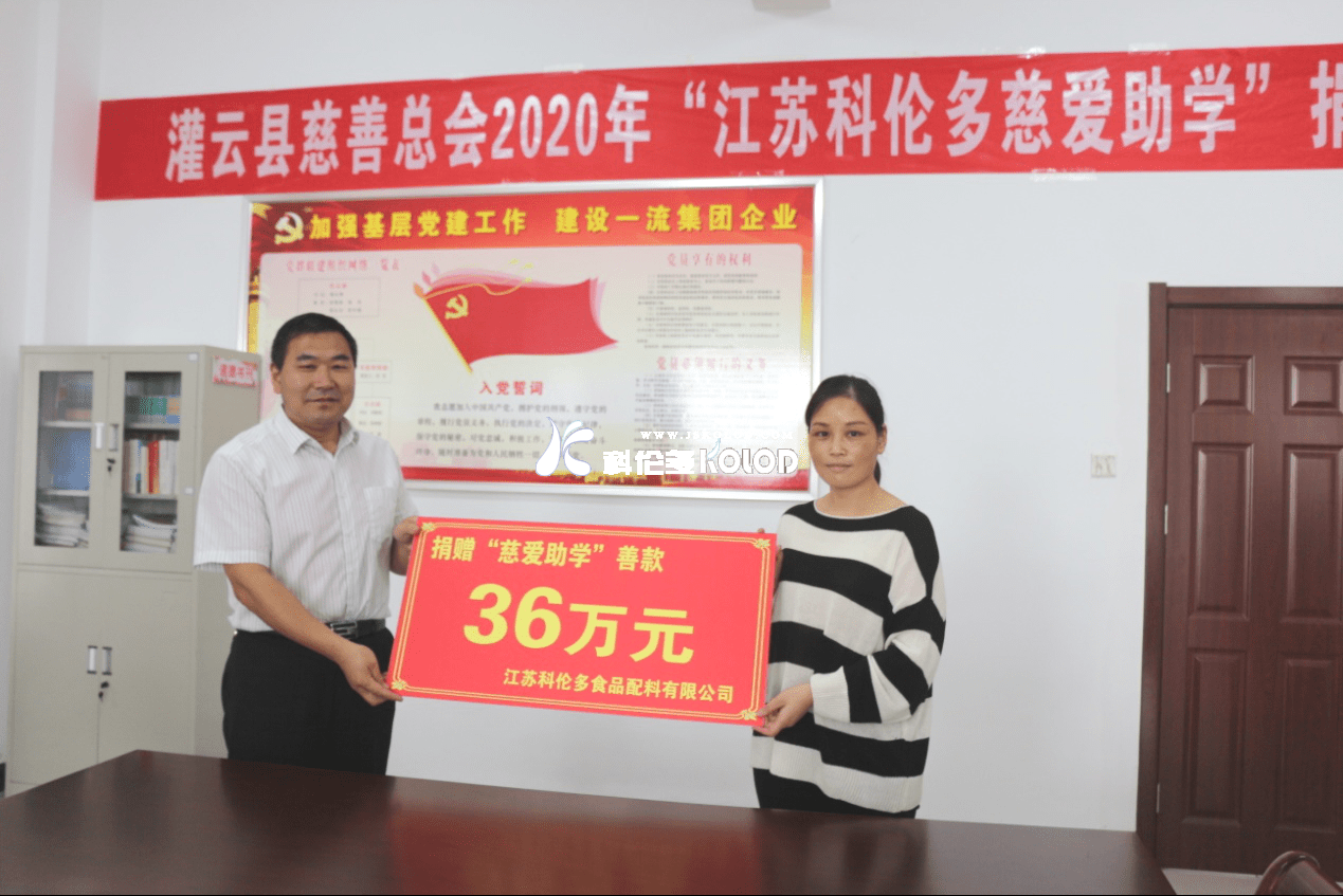 2020年9月25日下午, 2020年“江蘇科倫多慈愛助學(xué)”捐贈儀式在科倫多舉行,灌云縣慈善總會會長孫汝軍出席活動。江蘇科倫多食品配料有限公司今年計(jì)劃捐贈慈愛助學(xué)資金約175萬元,此次捐款36萬元,共捐助70名困難大學(xué)生和32名困難高中生。本次活動在灌云報(bào)、今日灌云等媒體上進(jìn)行報(bào)道。